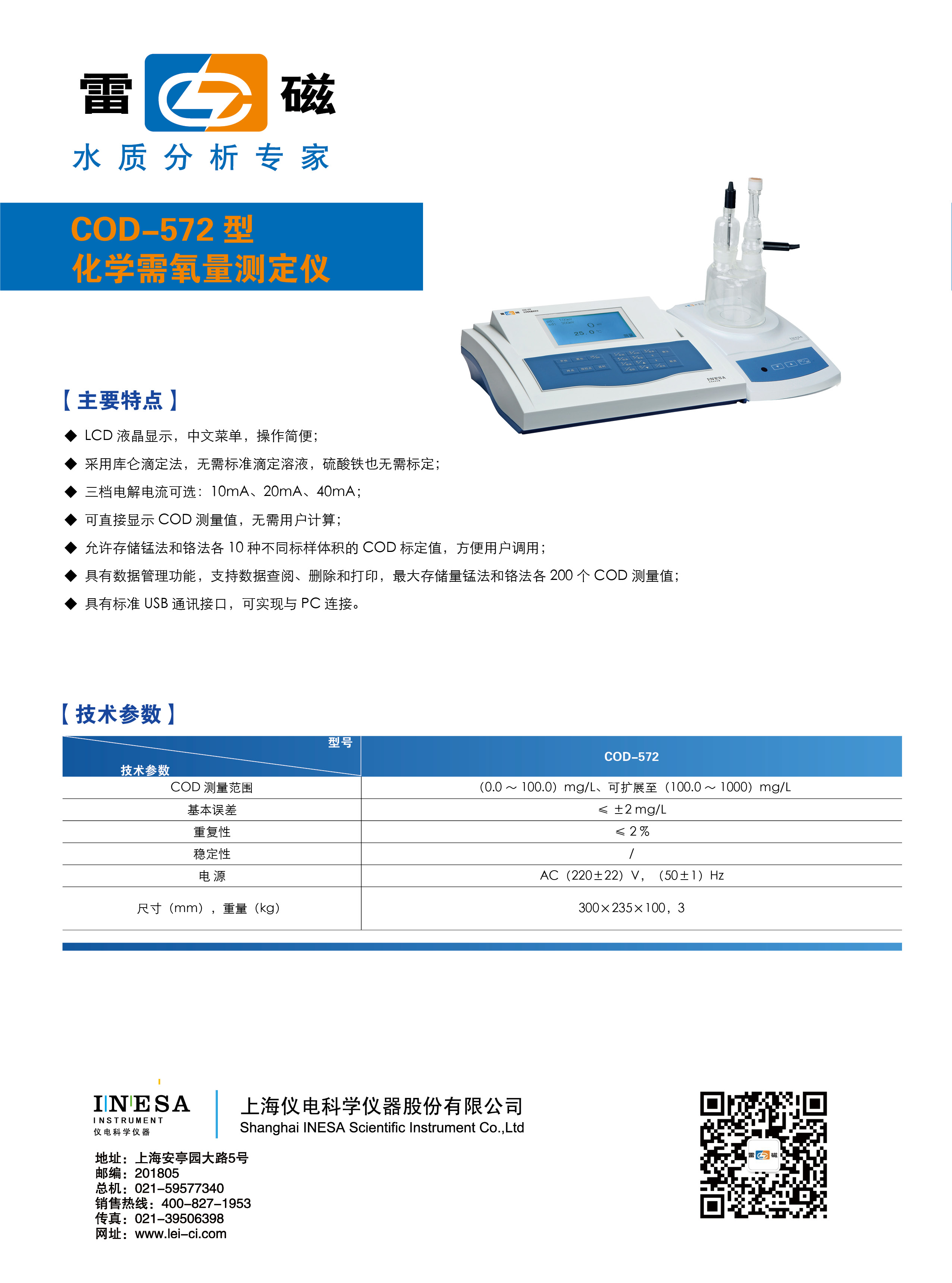 ※ 允許存儲錳法和鉻法各10種不同標樣體積的COD標定值,方便用戶調用;