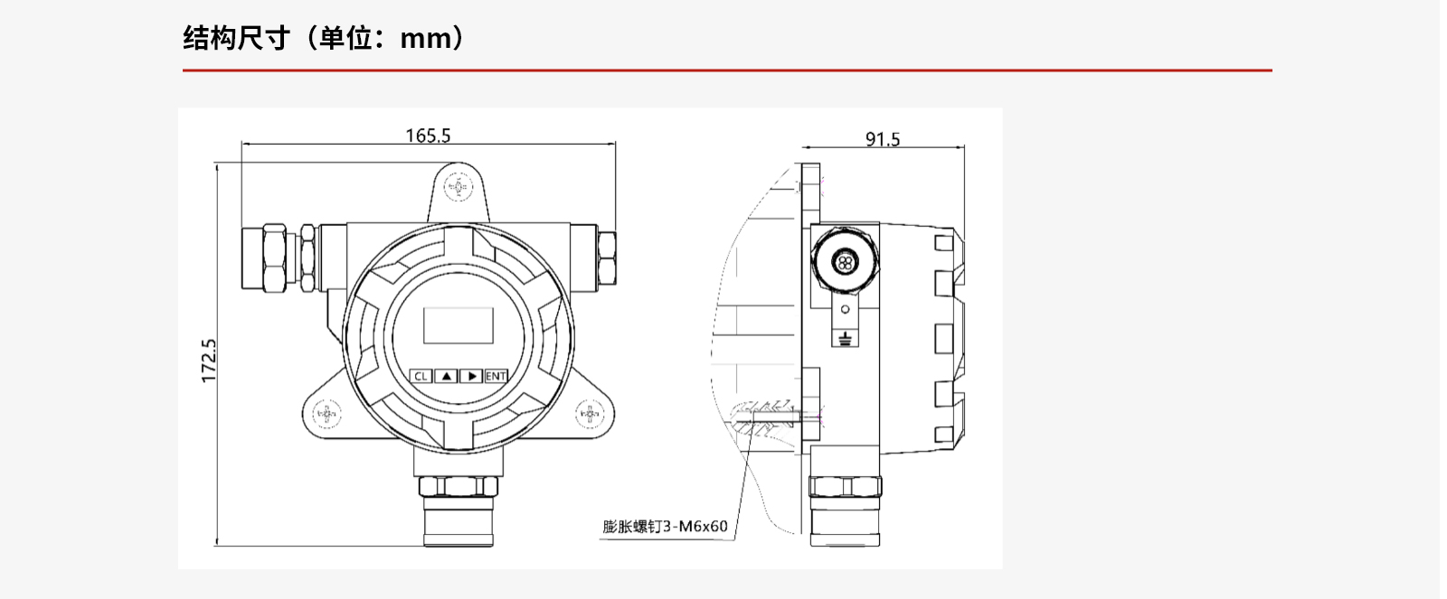 GTYQ-RD2000A在線式氣體報警器是我公司研制生產(chǎn)的一款氣體在線檢測儀器,能夠檢測不同環(huán)境中的可燃?xì)怏w、氧氣及有毒有害氣體的濃度,并在達(dá)到或超過預(yù)設(shè)報警限值時及時報警,產(chǎn)品可根據(jù)用戶情況自行設(shè)定低限或高限報警值。 在線式氣體報警器的傳感單元采用自然擴(kuò)散的方式采集環(huán)境中特別是室內(nèi)環(huán)境中特定氣體的含量,采樣信號通過變送器處理后不但可以就地顯示,并且可以以(4~20)mA模擬信號、RS-485通訊信號和開關(guān)量報警信號的方式進(jìn)行遠(yuǎn)傳和驅(qū)動。報警器具有墻面、抱管等多種安裝方式。