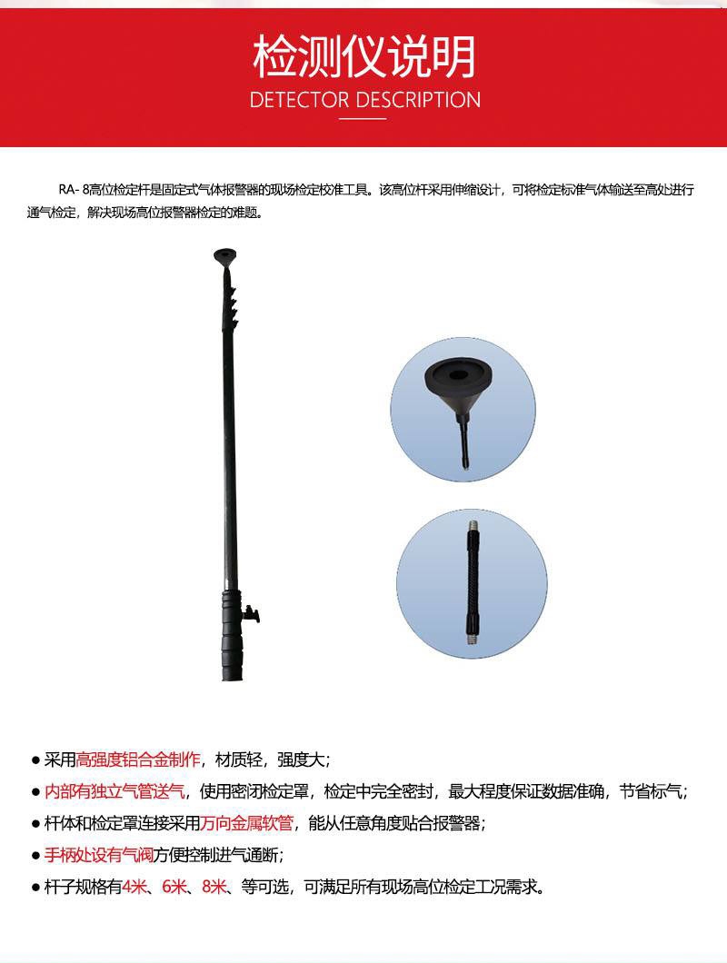 高位檢定桿是一款可燃氣體報警器、氣體檢漏儀、有毒有害氣體分析儀等氣體儀表的現場檢定校準的輔助工具。該裝置可直接與標準氣瓶輸出口連接,通過伸縮手柄將標準氣體輸送至高處、管道等狹小或者難以接觸的地方,實現對報警器的檢定工作。