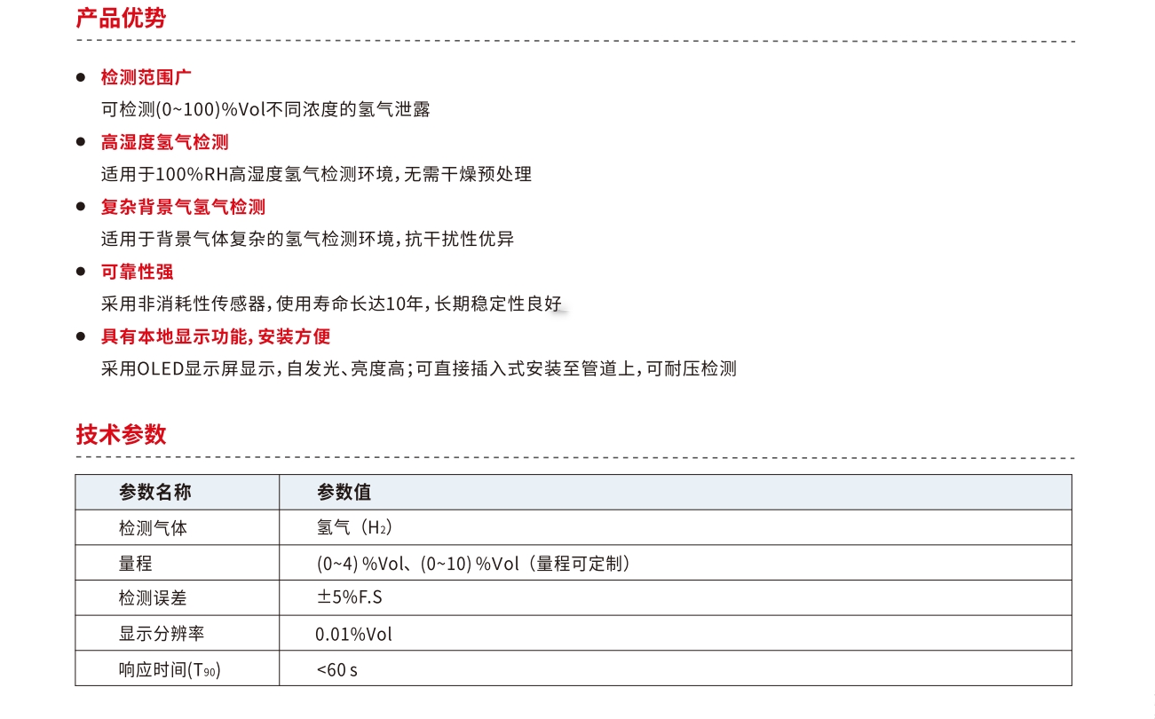 PDM400型在線氫氣分析儀采用鈀合金薄膜氫氣傳感器,可檢測不同環境中氫氣的濃度,通過(4~20)mA模擬信號、RS-485通信信號或開關量報警信號的方式進行遠傳和驅動,實時顯示測量結果。儀表支持管道式安裝方式,適用于水電解制氫、天然氣摻氫、氨裂解制氫、甲醇重整制氫、燃料電池系統測試臺架儲能電站等各種工業級的氫氣在線監測。
