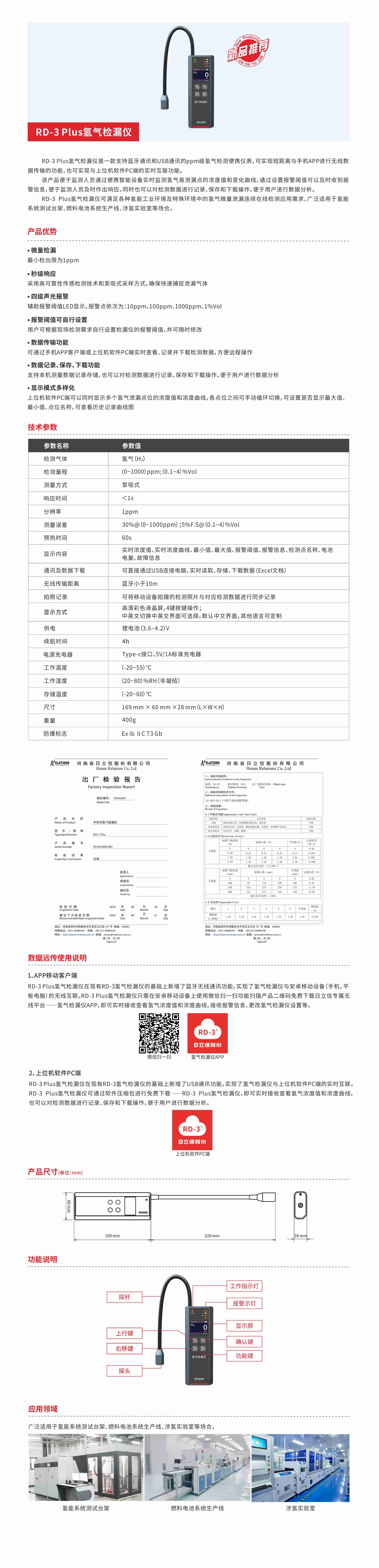 RD-3Plus氫氣檢漏儀是一款支持藍牙通訊和USB通訊的ppm級氫氣檢測便攜儀表,可實現短距離與手機APP進行無線數據傳輸的功能,也可實現與上位機軟件PC端的實時互聯功能。 該產品便于監測人員通過便攜智能設備實時監測氫氣易泄漏點的濃度值和變化曲線,通過設置報警閾值可以及時收到報警信息,便于監測人員及時作出響應。同時也可以對檢測數據進行記錄、保存和下載操作,便于用戶進行數據分析。RD-3 Plus氫氣檢漏儀可滿足各種氫能工業環境及特殊環境中的氫氣微量泄漏連續在線檢測應用需求,廣泛適用于氫能系統測試臺架、燃料電池系統生產線、涉氫實驗室等場合。